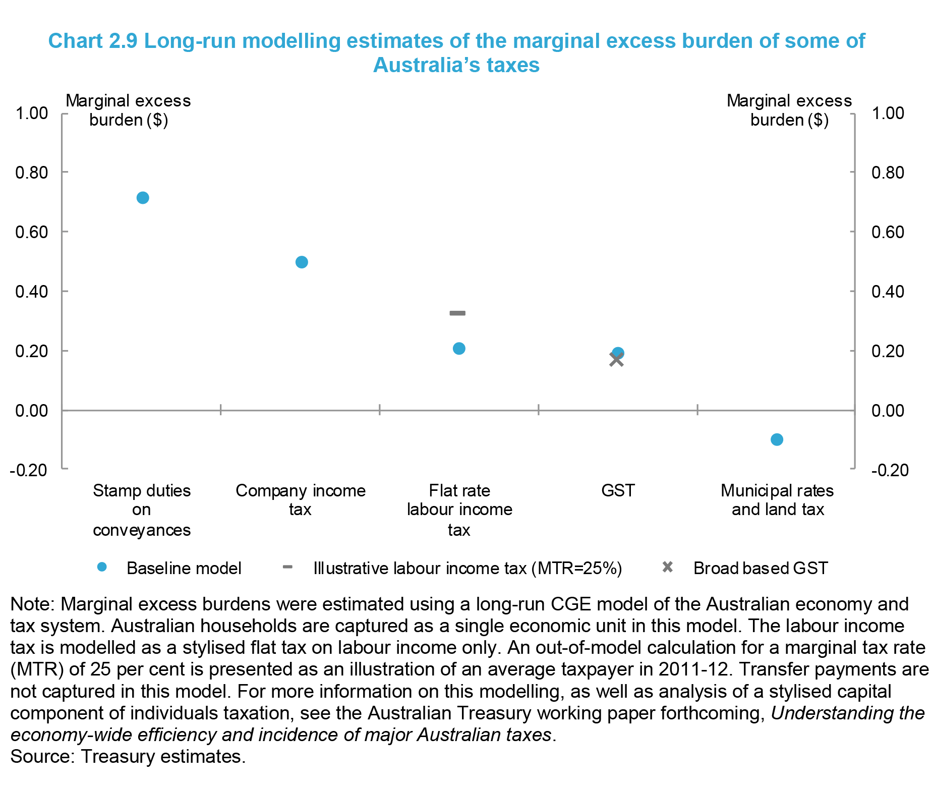 “Our estimate of the marginal excess burden on individual’s labour income and GST are very similar at around 21 cents and 19 cents respectively. This aligns with the intuition that taxation of labour income and GST both effect the real purchasing power of wages, with a similar incidence on labour supply.”